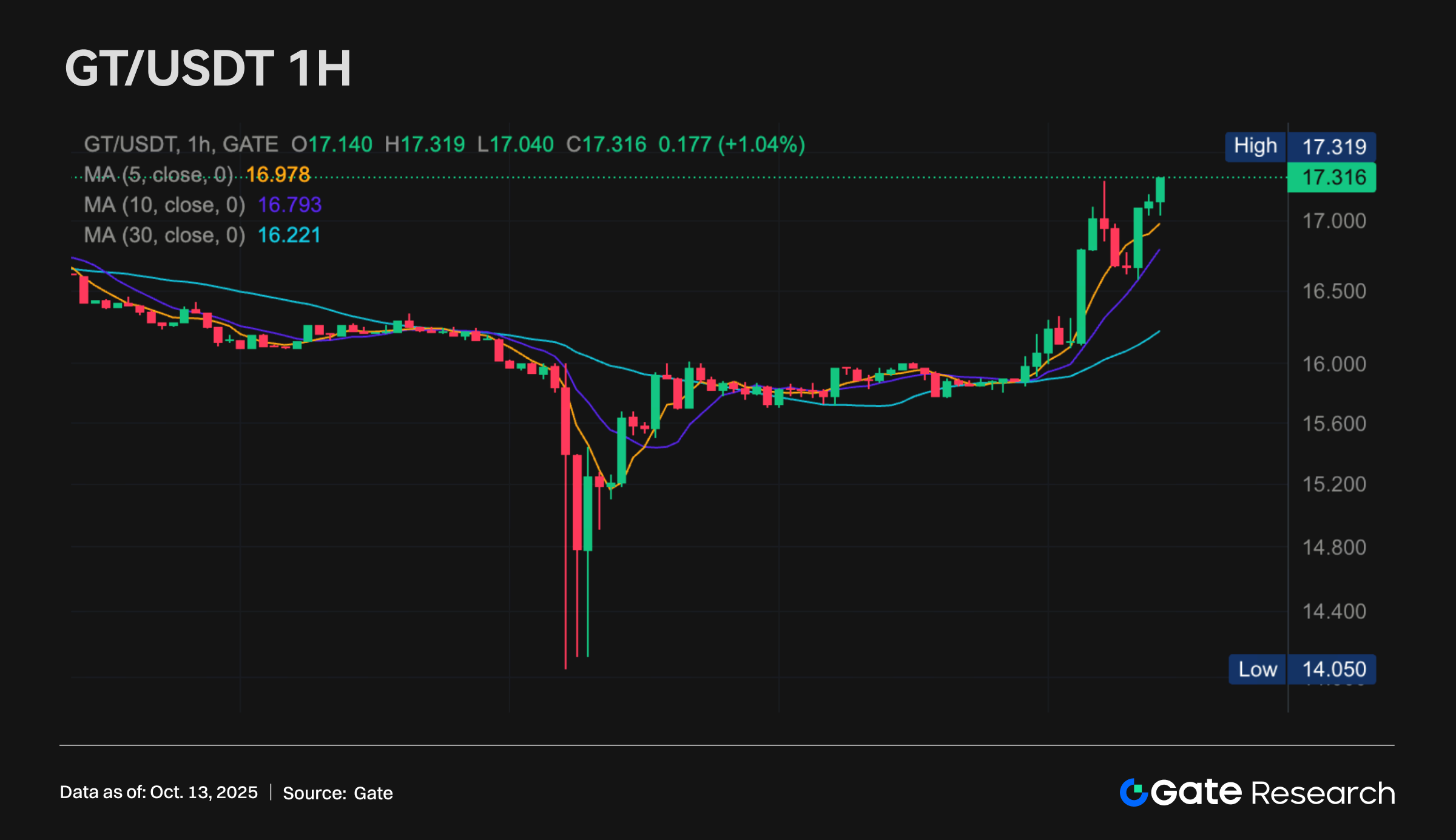 GT після швидкого спаду 11 жовтня отримав сильну підтримку приблизно на рівні 14 доларів, після чого відбулося бокове злиття та в ніч на 12 число почалося помітне зростання обсягів. Поточна ціна вже кілька разів піднімалася на зелених свічках, короткострокові середні значення MA5 та MA10 швидко перетнули MA30, сформувавши чітке бичаче розташування, що свідчить про сильну висхідну енергію.