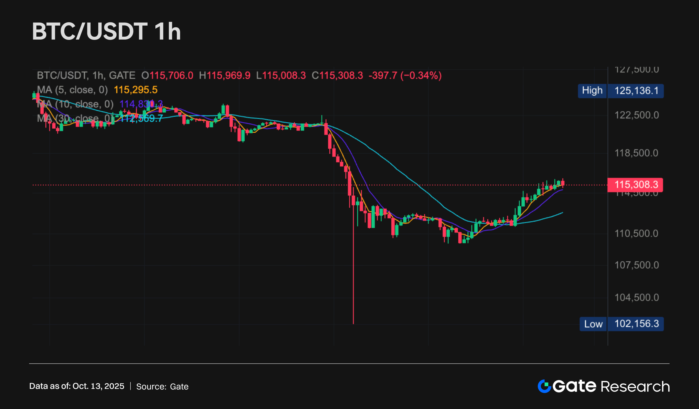 BTC поточна ціна, після швидкого падіння 11 жовтня (мінімум досягнув приблизно 102,000 доларів), демонструє ознаки відскоку. Короткострокові середні (MA5, MA10) сформували золотий перетин на низькому рівні та перетнули MA30, що свідчить про продовження тренду короткострокового відскоку. Ціна наразі знаходиться вище MA5, енергія залишається помірною, але в区间 115,500–116,000 доларів існує певний опір; якщо вдасться прорвати його обсягом, це може призвести до подальшого зростання до попередніх максимумів в区间 118,000–120,000.