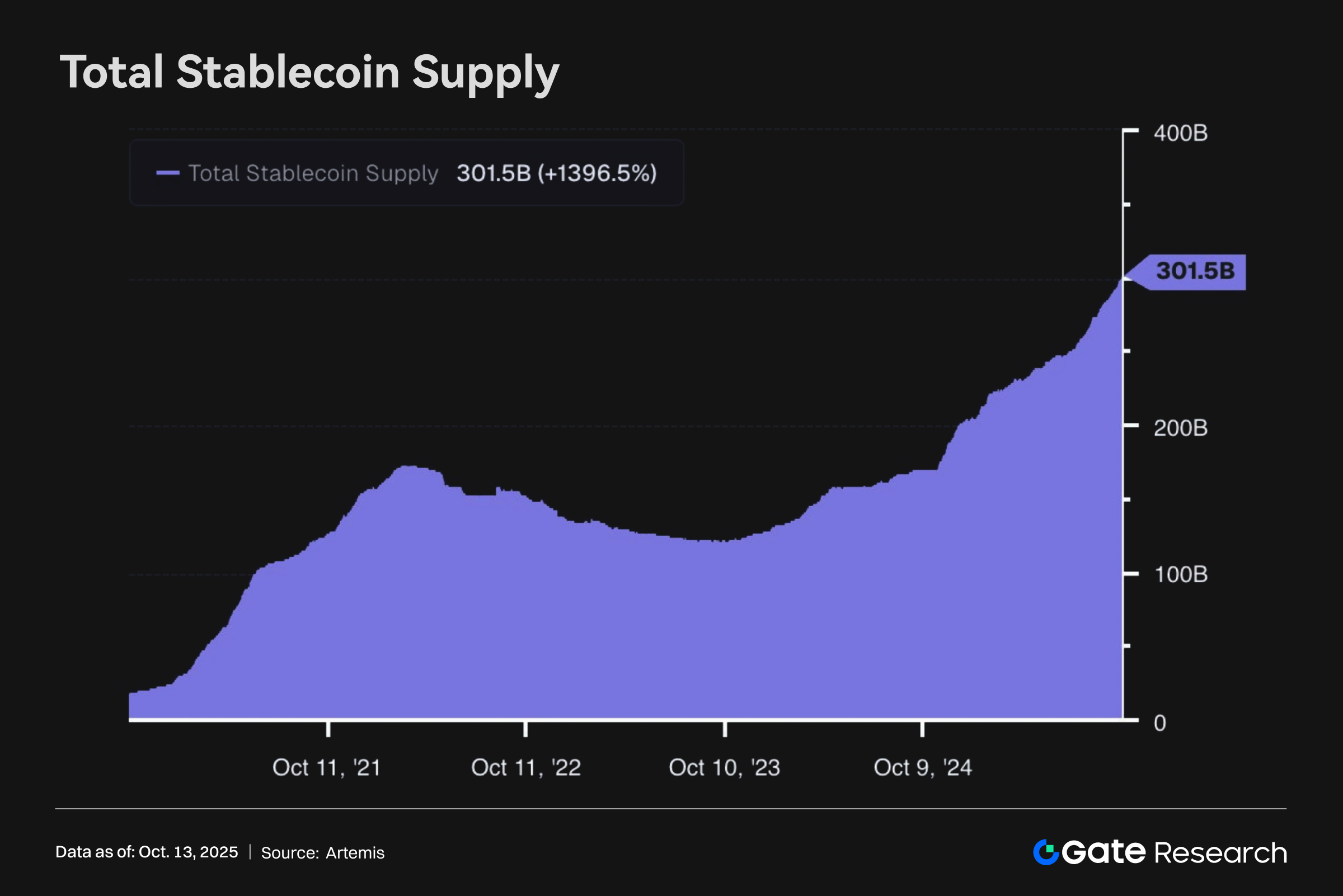 Згідно з останніми даними блокчейну, загальний обсяг постачання стабільних монет у світі перевищив 301,5 мільярда доларів, встановивши новий історичний максимум. Це зростання вказує на те, що ринок стабільних монет продовжує прискорюватися, особливо на тлі прогресу в процесі регулювання та впровадження з боку інституцій, стабільні монети стають однією з найбільш визначених категорій активів у глобальній системі криптофінансів.