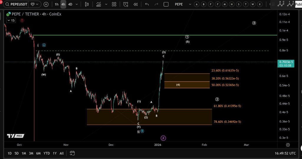 Ціна PEPE вийшла з ширшої зони підтримки навколо рівня $0.0000035 і рухалася вгору майже без пауз. Такий вертикальний рух є ознакою сильної попиту, але він також залишає дуже мало структури під ним.