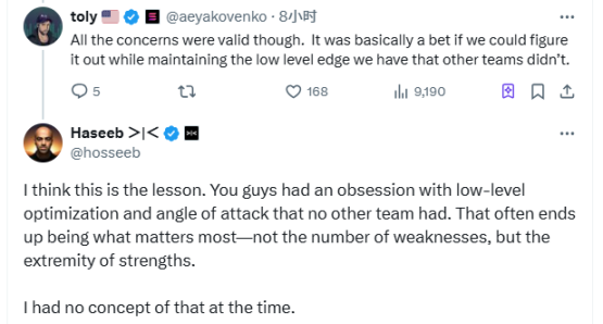 Потім Хасіб відповів Толі: “Я думаю, що це один із уроків. Ваша наполегливість на оптимізацію на нижньому рівні та унікальний кут нападу, які не є характерними для інших команд. Це вміння максимально розвивати свої сильні сторони і уникати слабких - саме це найважливіше. Тоді я абсолютно не розумів цього”.