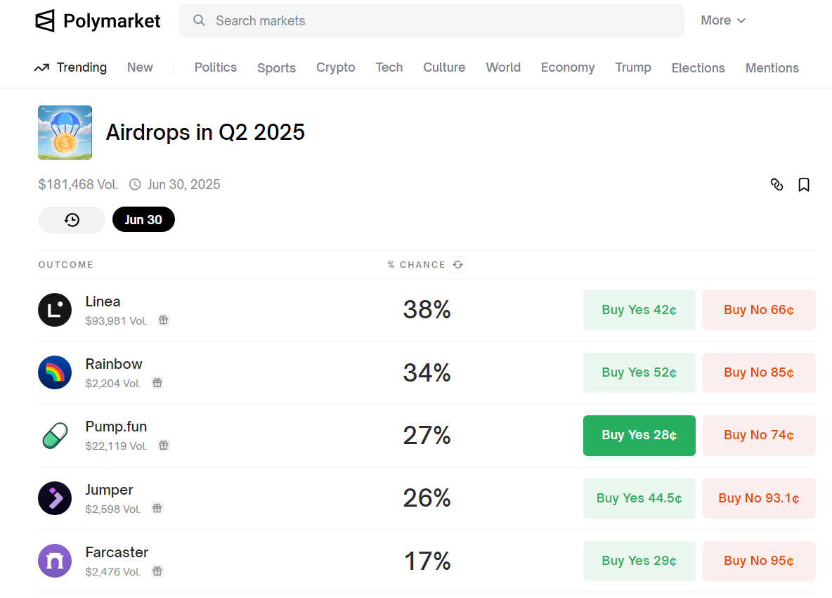 ! Гравці на Polymarket вважають, що Linea є найімовірнішим проектом для запуску події airdrop у 2 кварталі 2025 року, 16 травня 2025 року