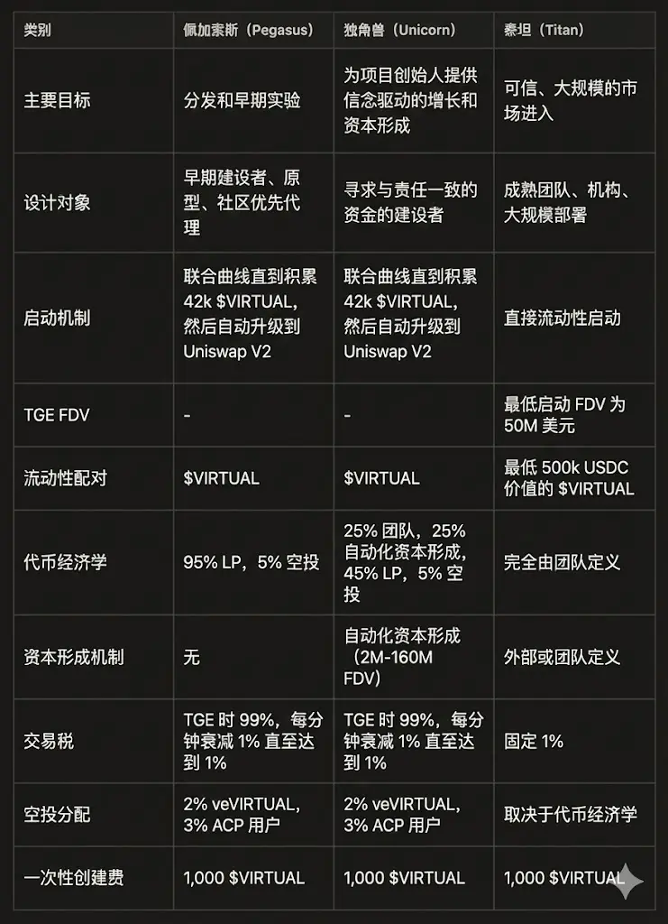 Tổng quan về ba cơ chế phát hành đại lý của Virtuals: Pegasus, Unicorn và Titan
