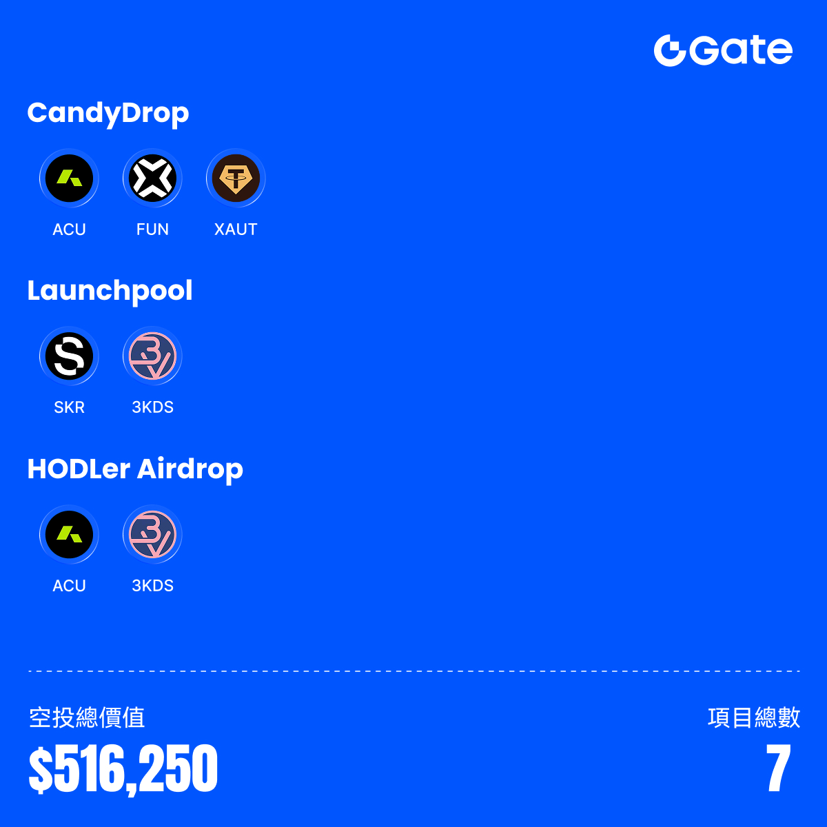 本週期 Gate 上線了 11 個新項目,3 個 CandyDrop 項目,2 個 Gate Launchpool 項目和 2 個 HODLer Airdrop 項目,累計空投總價值為 $516,250。