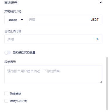 策略觸發價:當市場最新價小於等於觸發價格後,網格才會開始運行;觸發價配置需小於最新價,且在網格區間的最低價和最高價之間。