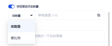 數量遞增:數量遞增默認是關閉狀態,當開始時您可以選擇按照數量,或按照比例來增加每個網格的買賣數量,如圖所示: