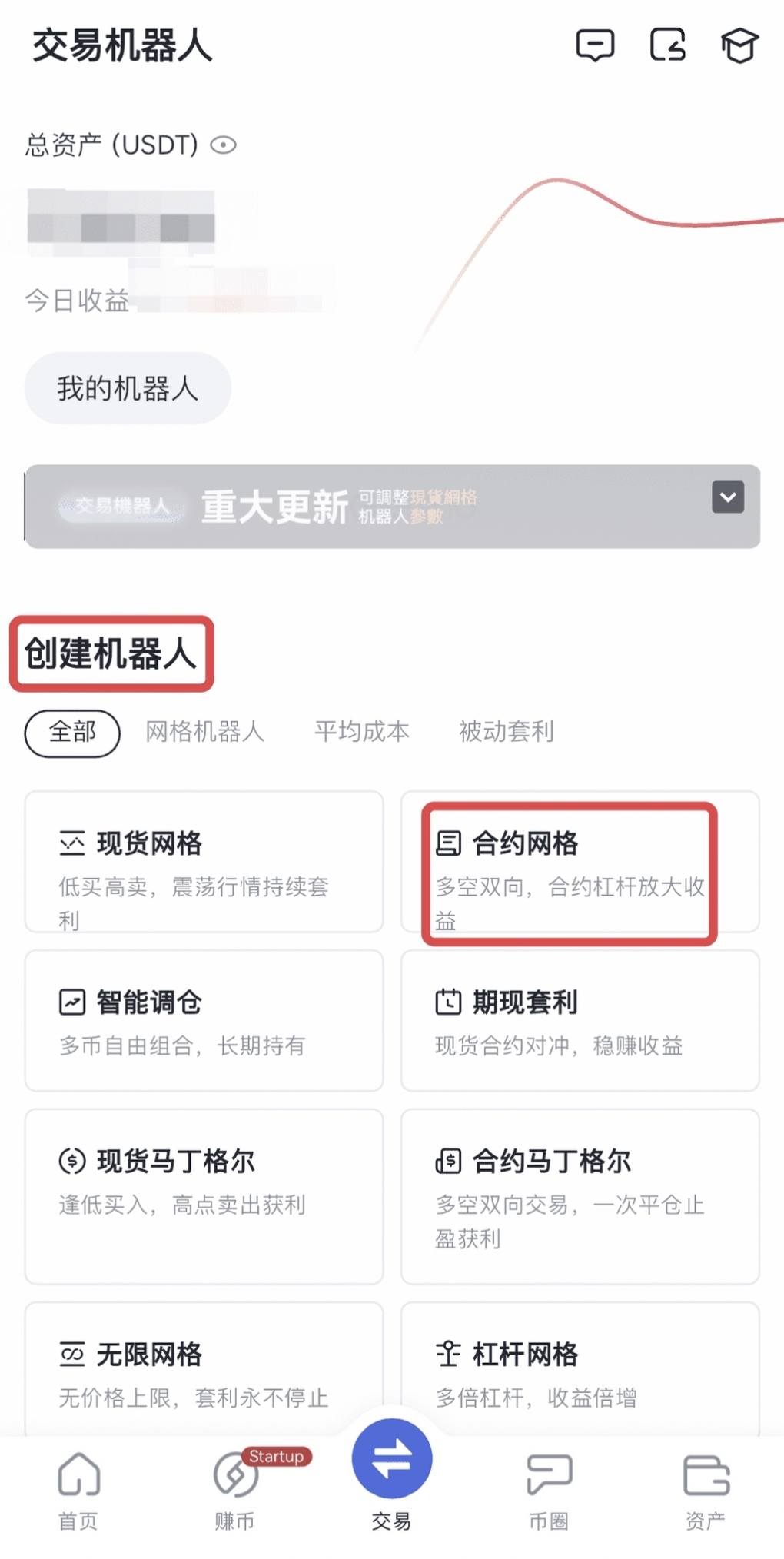 導航欄—交易機器人—機器人廣場—創建新機器人—推薦—合約網格—點擊創建機器人—配置參數—點擊創建