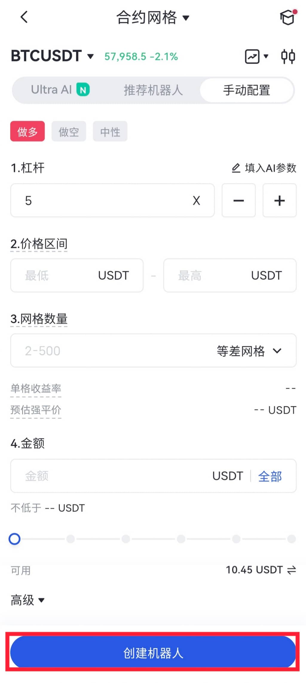 3.自定義創建:您可根據自己對震盪行情的區間判斷來設置參數觸發條件,確認投資金額即可創建合約網格機器人。