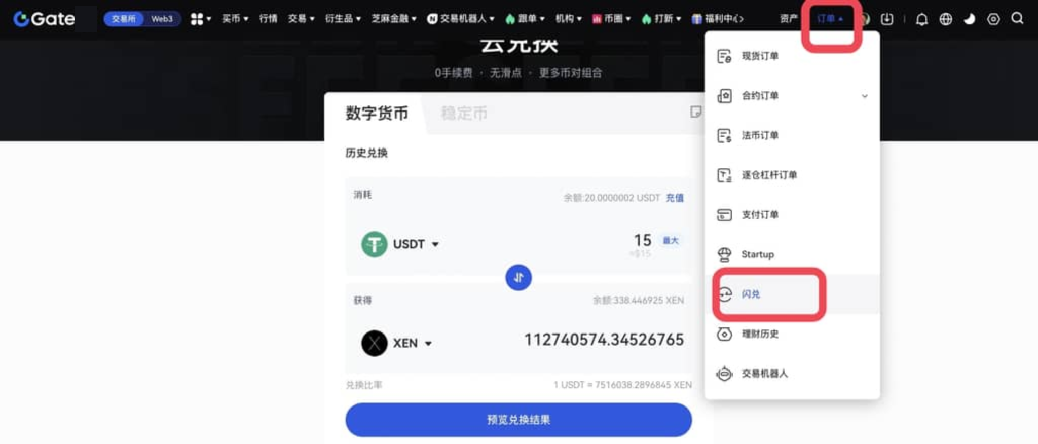 兌換成功後,可以點擊頁面右上角“訂單”—“閃兌”,進入閃兌交易歷史頁面,查看交易歷史。
