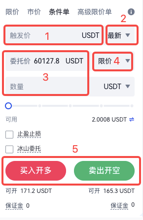 - 條件單爲策略委托,只有在標記價格/最新價格達到觸發價格時,才會按照用戶設置的委托價格、委托數量、買賣方向進行委托,該委托不會預先佔用倉位或保證金。