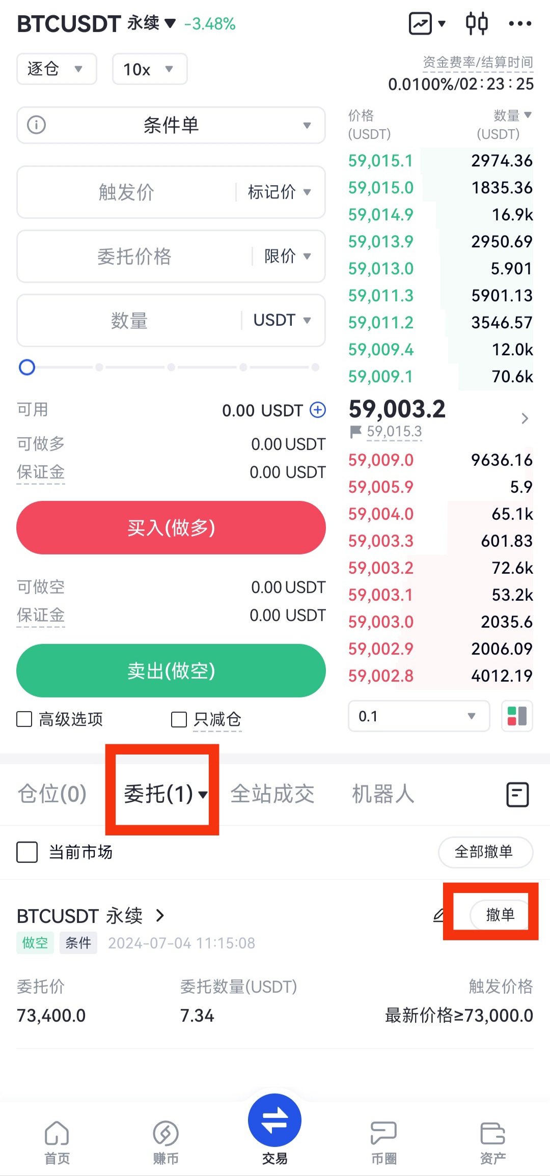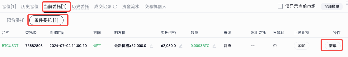 委托提交後-條件未觸發前,可在“當前委托”下的“條件委托”中查看委托情況,條件觸發後未全部成交或還未成交,可在 “當前委托” 下的 “普通委托” 中查看委托情況,如需撤銷也可以點擊撤銷按鈕。
