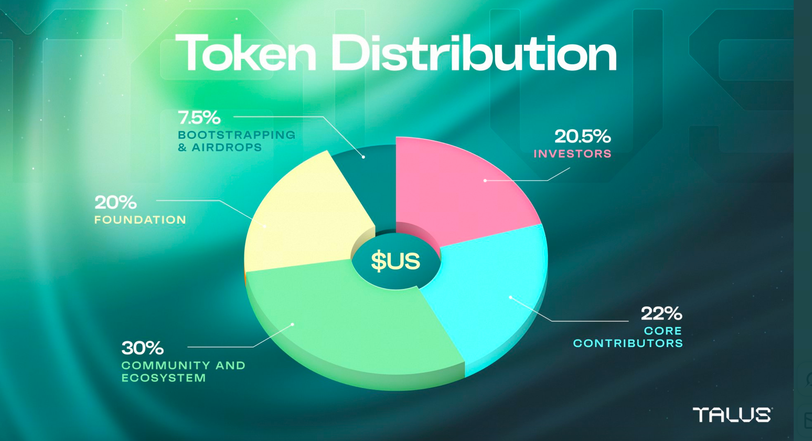一個穩健的經濟模型離不開深思熟慮的代幣分配。 Talus 將總供應量 100 億枚 US 的 30% 分配給了「社區與生態系統」,這是佔比最大的部分,旨在通過開發者資助、工具上線激勵、流動性提供等方式,長期引導真實使用。 這部分代幣的大部分將在 36 個月內線性釋放,確保增長源於實際活動而非短期炒作。