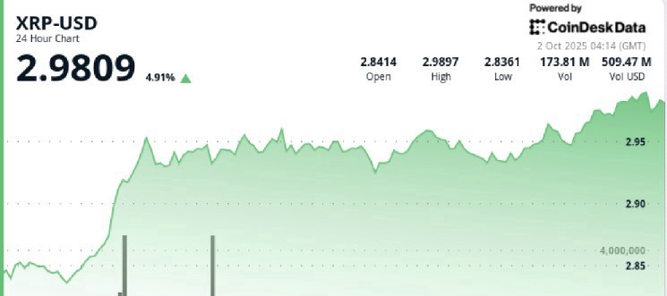 在一家主要的日本金融機構推出機構貸款計劃後,XRP飆升至新高,交易量超過1.6億,推動價格突破關鍵阻力位。買家多次捍衛$2.93,隨着資金流的整合,10月18日的ETF決定窗口現在爲下一個突破測試$3.00鋪平了道路。
