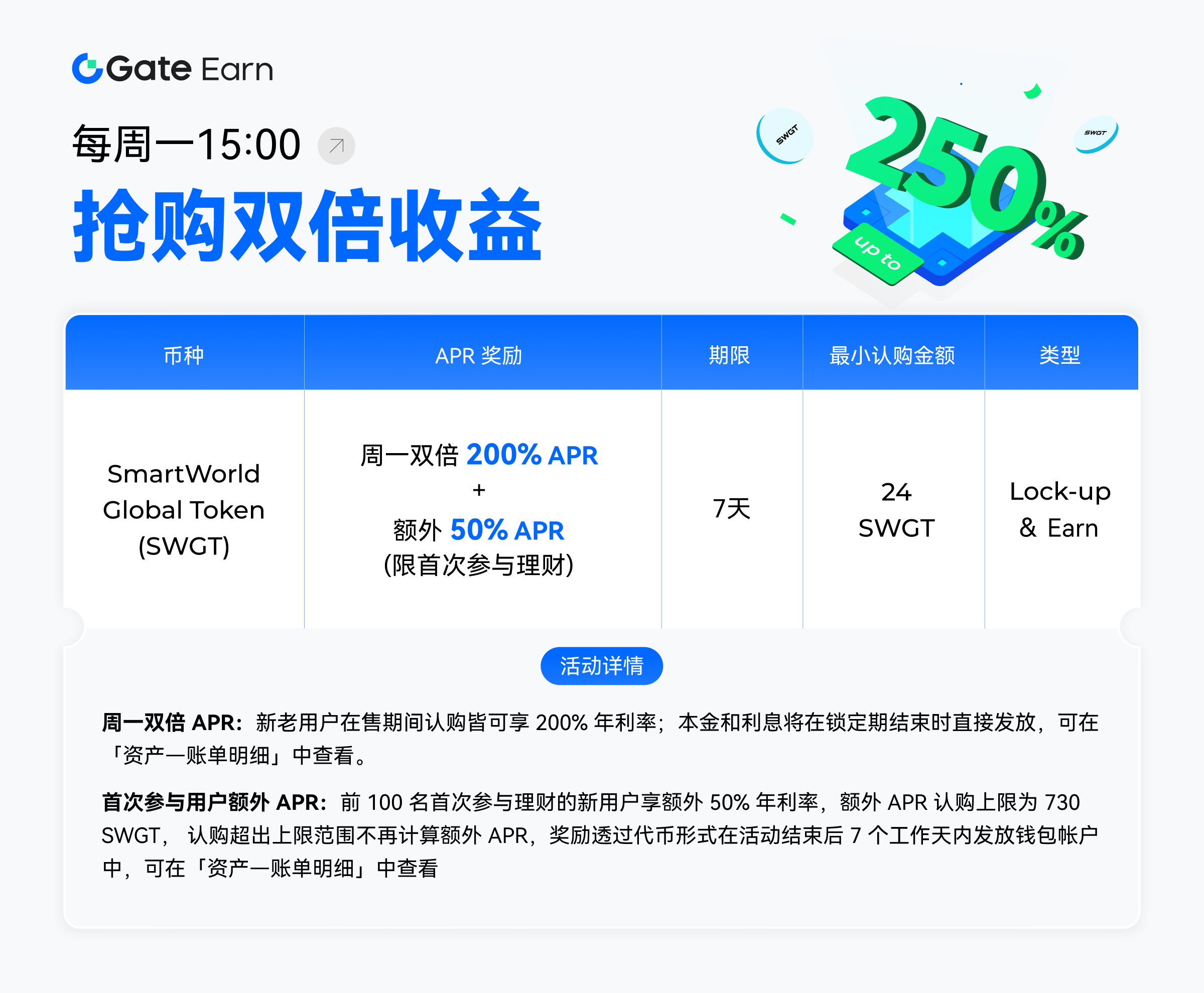 Gate Hodl & Earn 每周一推出一款低门槛、高安全性和高收益率的产品。您可以享受双倍的稳定利润和高年利率!首次参与理财的用户参与还将享有额外的专享 APR。