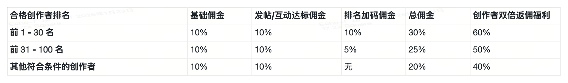 平台将于每周根据创作者内容的 发帖数量及帖子互动表现(点赞 / 评论 / 分享 / 转发)进行综合排名;当周互动排名 前 100 名创作者,可获得额外返佣加码: