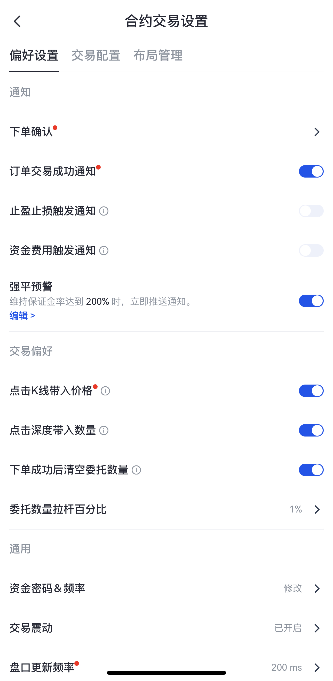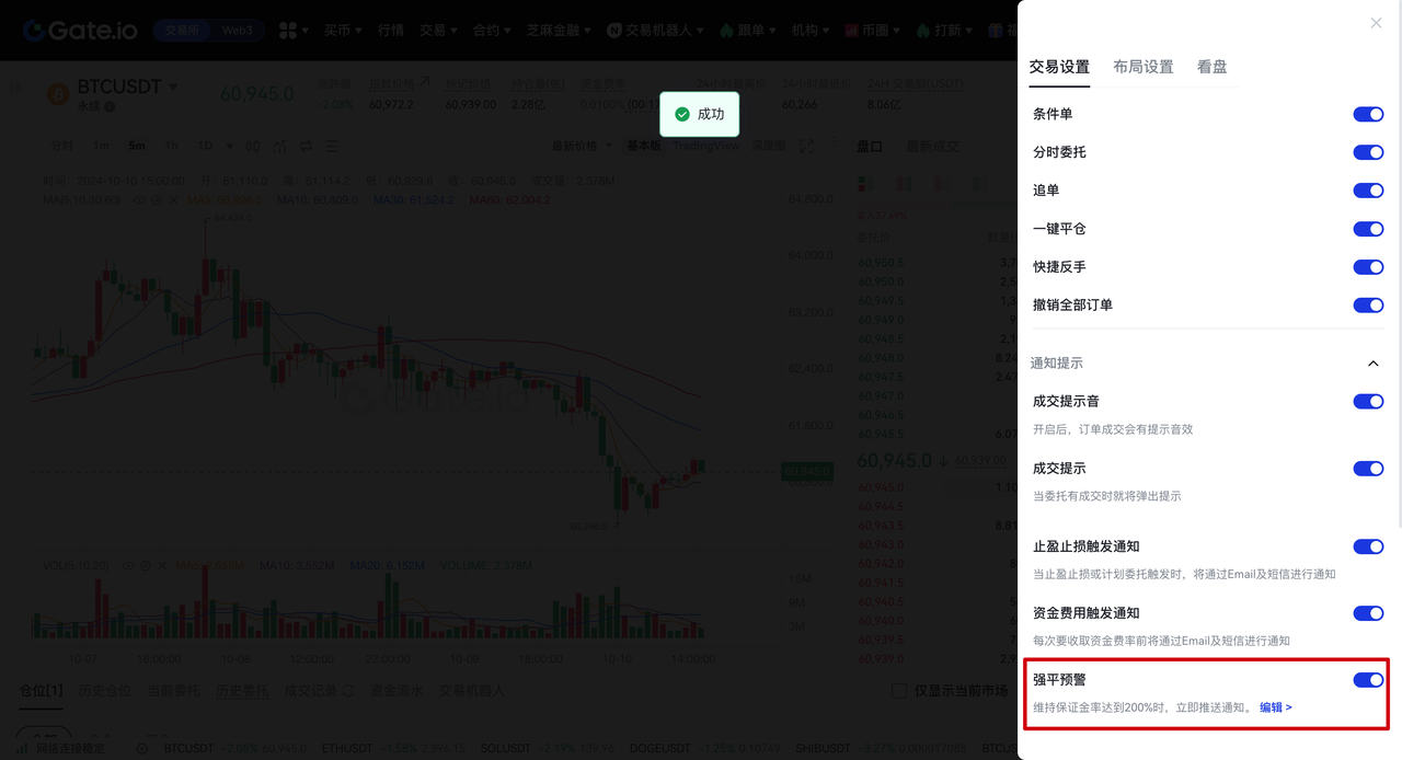 - 在交易设置页面,找到【通知提示】—【强平预警】。