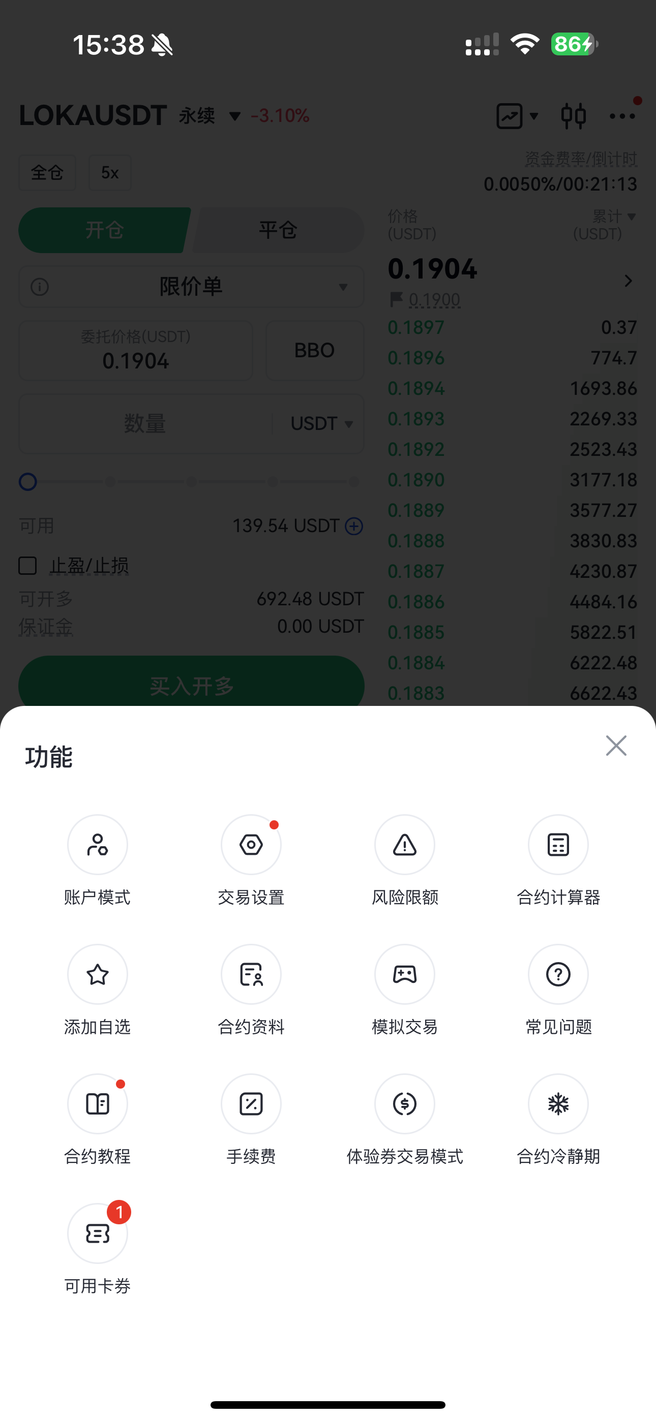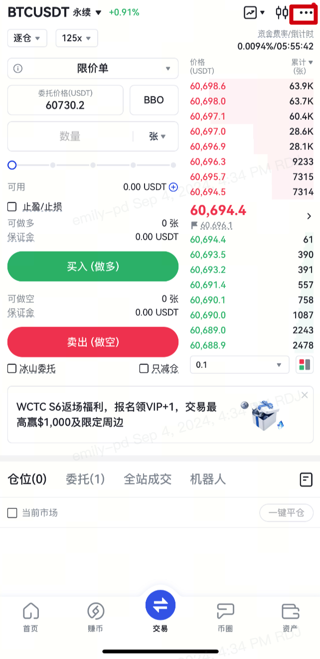 - 进入【合约】页面,点击右上角的【交易设置】。