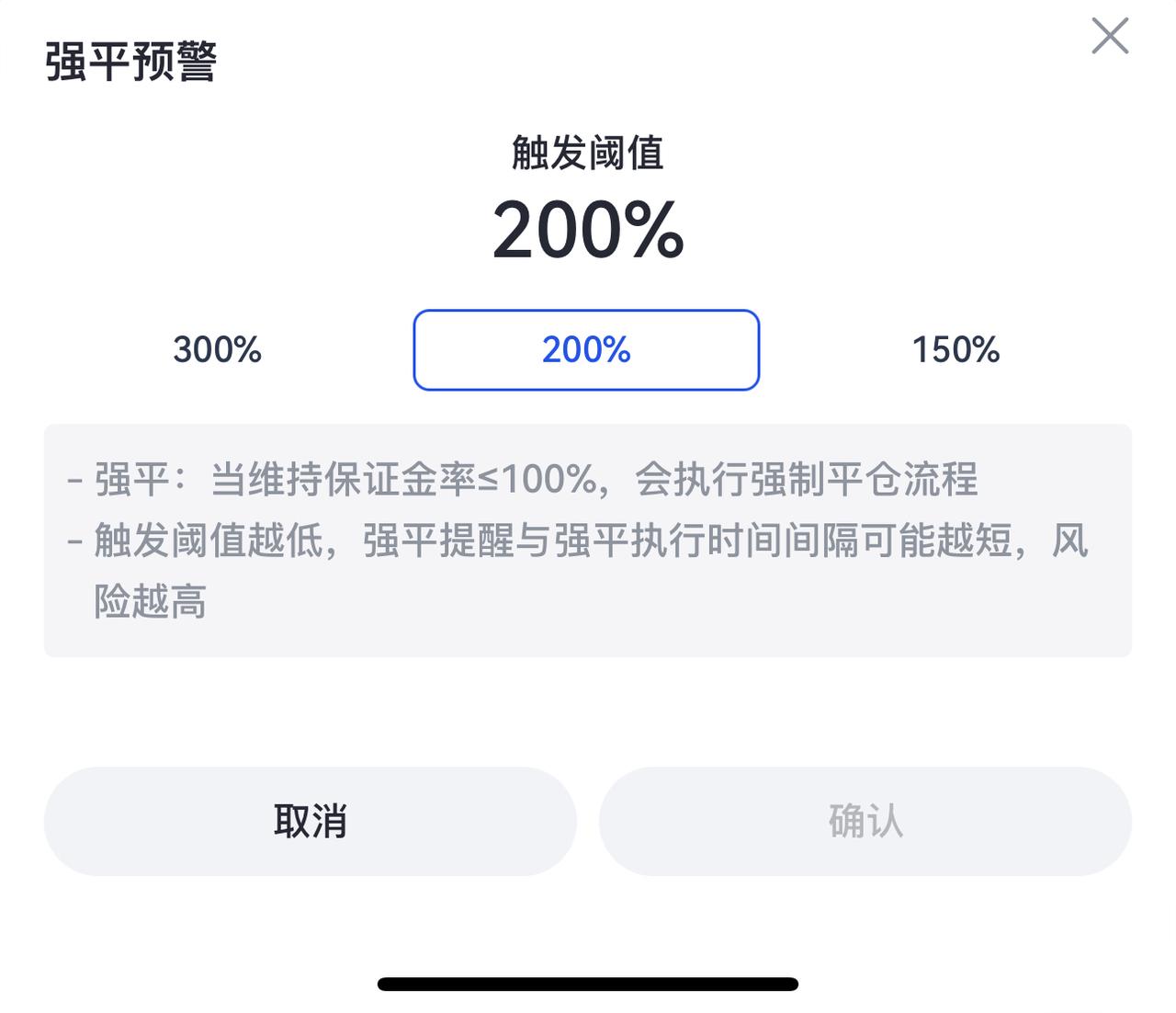 - 在弹出的【强平预警自定义】窗口中,您可以选择【300%】、【200%】或【150%】作为保证金率的预警阈值。默认为【200%】。
