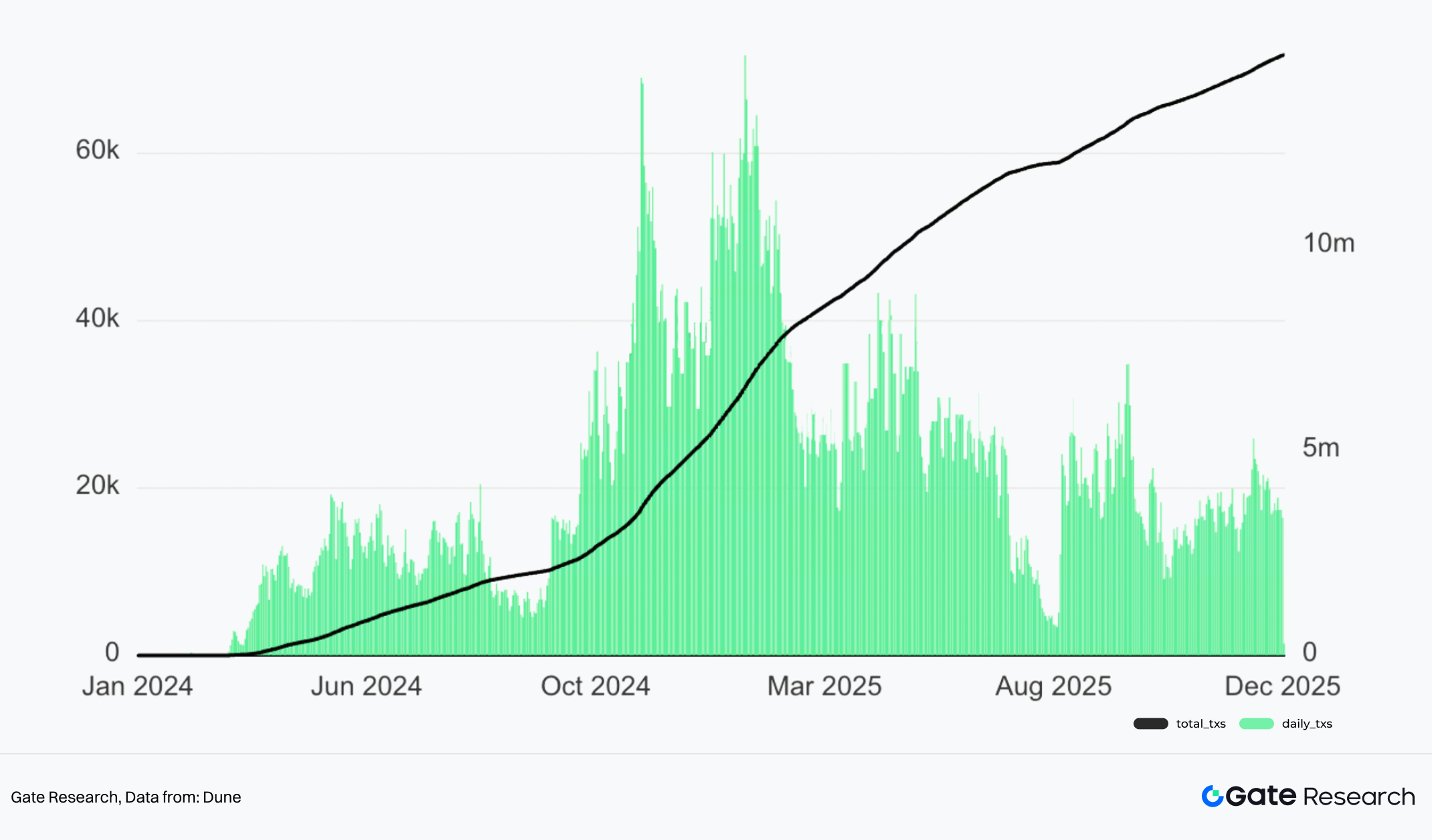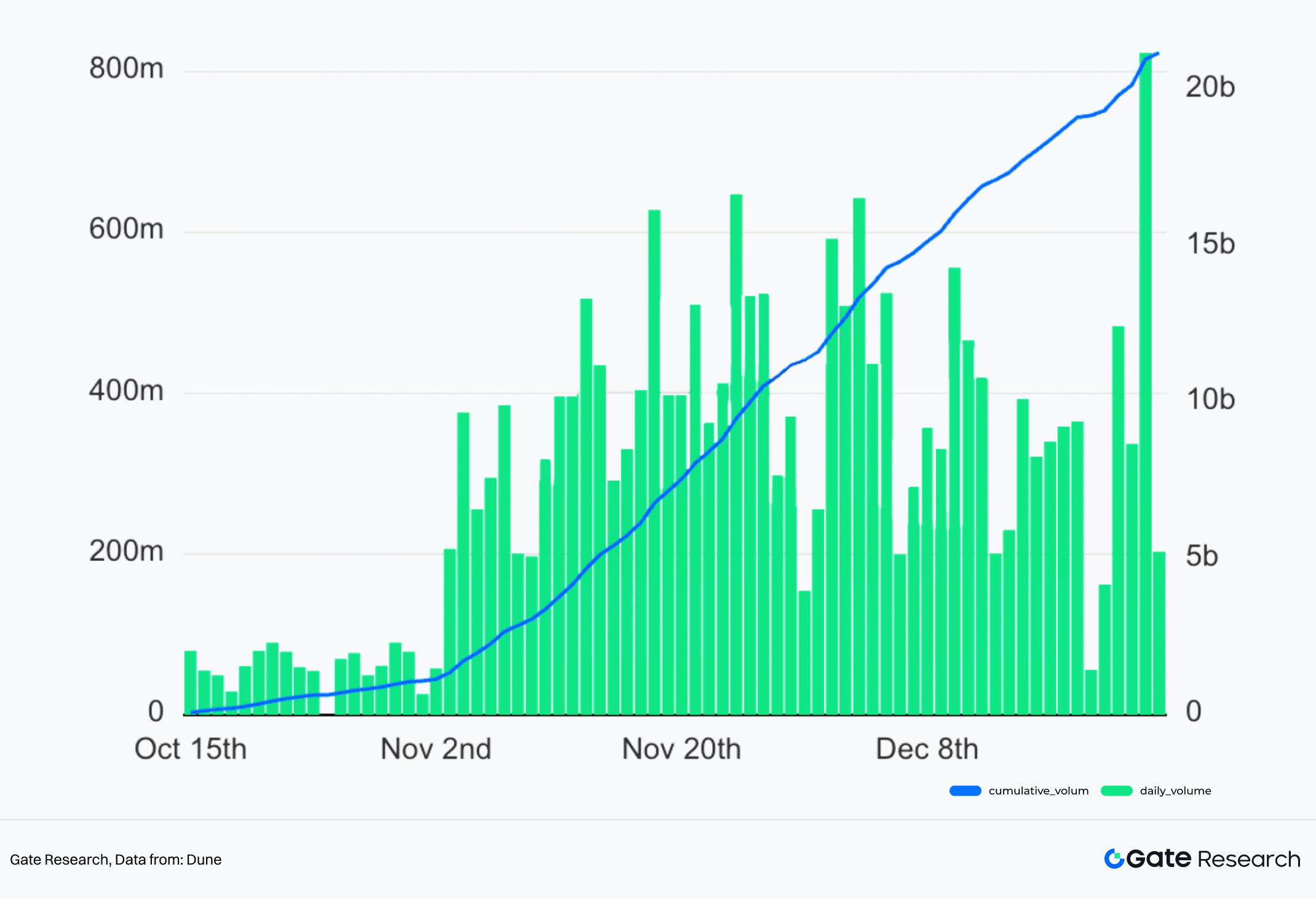 Gate Web3 Wallet 通过内置的 Swap、跨链桥、Perp DEX 等功能直接捕获链上交易手续费分成。在这些功能中以 Gate Perp DEX 增长最快,未来将有望成为 CEX 整体收入的重要补充。自 9 月末推出以来,在不到 3 个月时间,Gate Perp DEX 累计交易量突破 210 亿美元,其中在 12 月 24 日创下超 8 亿美元单日交易量新高。