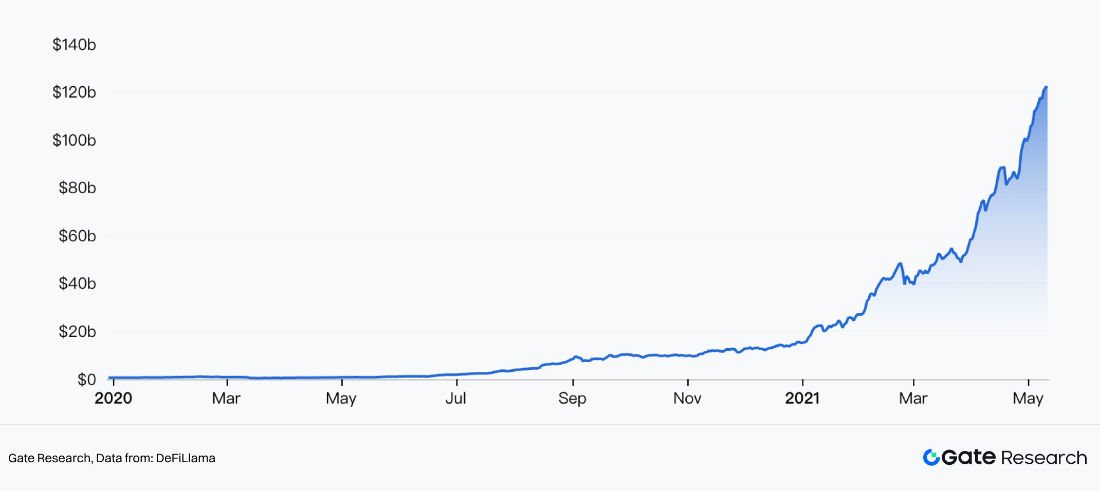 DeFi Summer 是 DeFi 从边缘实验阶段进入爆发式增长期。这一时期,Ethereum 生态内多个核心协议的创新与流动性激励机制叠加,导致链上金融活动激增,TVL 从 2020 年初的约 6 亿美元飙升至 10 月首次超过 100 亿美元,并在次年的 4 月首次突破 1,000 美元关口。