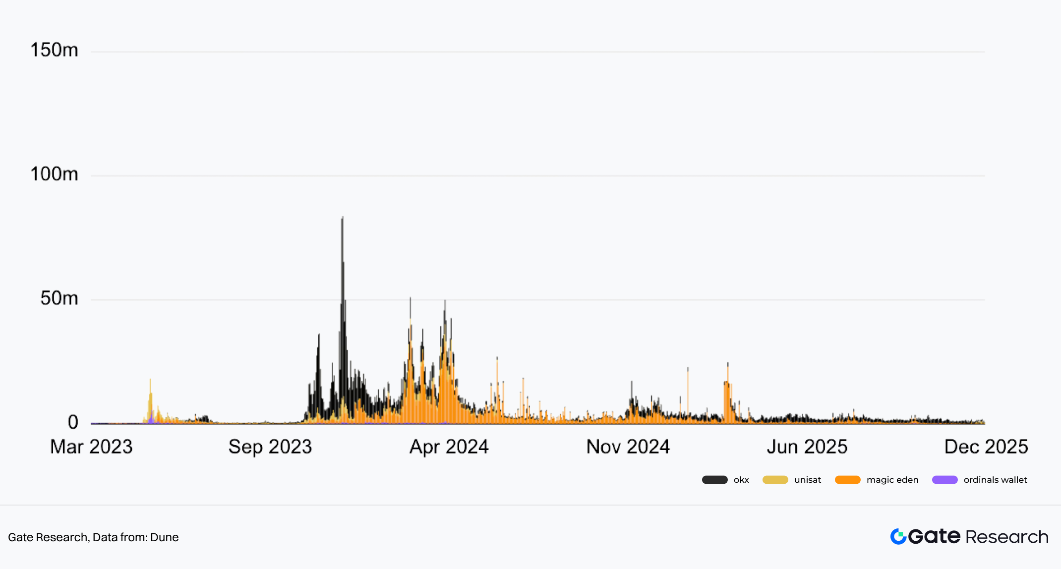 BRC-20 的出现迅速引发了社区关注与投机热情,并在 2023 年上半年形成显著的链上交易与铸造活动。用户也对钱包提出了新的要求:对铭文资产的可视化支持;对铸造、转移流程的封装与简化;对在 Bitcoin 网络上高频、小额链上交易的操作优化。