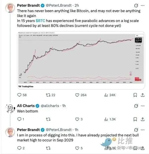 传奇交易员 Peter Brandt 最新复盘指出,比特币在 15 年内经历了 5 次“抛物线增长后回撤 80%”的循环,而本轮周期的调整尚未见底。尽管短期规律冷酷,但他通过周期推演,预判下一个牛市巅峰将在 2029 年 9 月 到来。