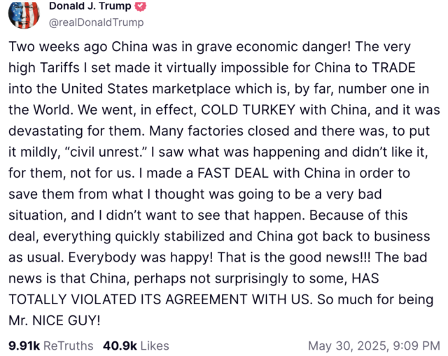 此次下跌似乎是由于特朗普总统在Truth Social上的发帖引发的。特朗普声称中国“完全违反”了与美国的协议,新的贸易摩擦担忧加剧了市场的不安。