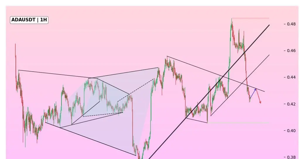 图表显示ADA在失去其上升结构并回测破裂趋势线的底部后急剧回落。