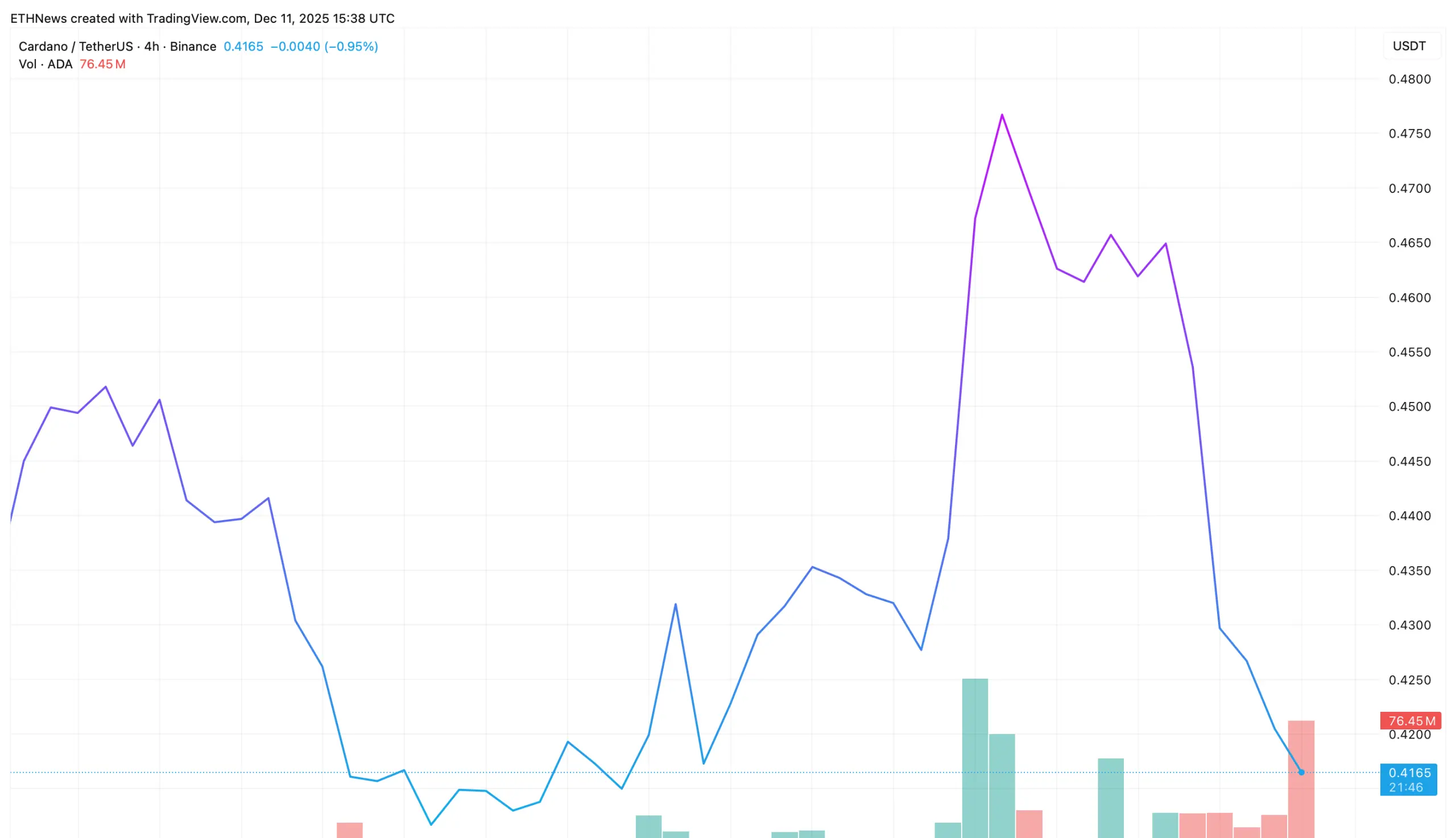TradingView 图表显示在上涨尝试时成交量逐渐减少,而在近期下跌至 $0.4165 时卖盘兴趣加重。这种失衡表明买家在建立支撑方面遇到困难,强化了价格被困在有意义的阻力线下方的观点。