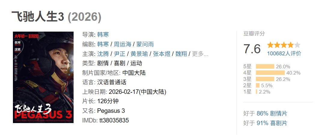豆瓣显示,《飞驰人生3 》最新评分为7.6分。